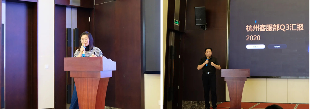 接下來,南京首屏副總經(jīng)理高娜、杭州客服部總監(jiān)任智鵬分別針對南京、杭州客服業(yè)務(wù)開展工作匯報,深度剖析Q3工作成果、分析總結(jié)存在的問題和難點,并對Q4的工作重心進行詳細規(guī)劃。